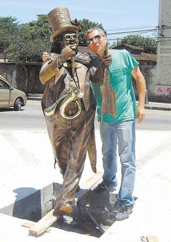 Amanhã, a estátua, que aqui você vê ao lado de seu criador, o escultor e cartunista Ique, será desembrulhada para a observação do público. Abelardo Barbosa, o apresentador pernambucano falecido em 1988 (o enterro parou o Rio), aparecerá caracterizado e com o famoso bacalhau, que, nos seus momentos mais divertidos, atirava à plateia.