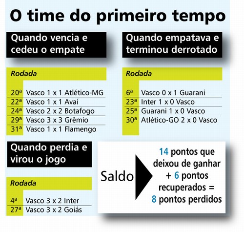 Sem chances de título e de vaga na Libertadores, e livre do fantasma do rebaixamento, o Vasco já pode dar por encerrada sua participação no Campeonato Brasileiro. Mas essa realidade poderia ser diferente se a equipe não caísse de produção com tanta frequência após o intervalo. Caso as partidas acabassem no primeiro tempo, o time da Colina estaria em situação bem melhor: na sexta colocação e brigando por um lugar no G4.