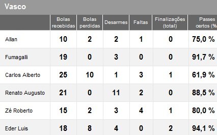 VASCO DA GAMA: Fernando Prass; Fagner (Irrazával, 15'/2ºT), Dedé, Douglas e Ramon (Diogo, 29'/2ºT); Rômulo, Renato Augusto, Allan (Fumagalli, Intervalo) e Carlos Alberto; Zé Roberto e Eder Luis. Técnico: Paulo César Gusmão