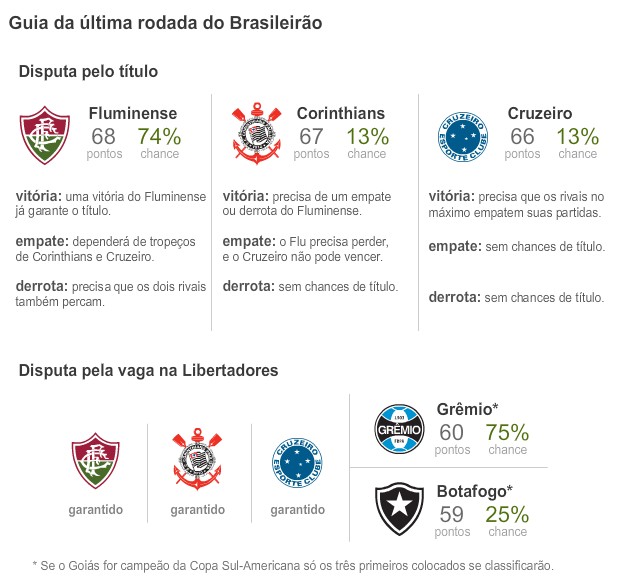 A última rodada do Campeonato Brasileiro ainda reserva muita emoção para nada menos do que 11 times. Na parte de cima da tabela, serão três na luta pelo título - Fluminense, Corinthians e Cruzeiro - e dois brigando por uma vaga na Taça Libertadores - Grêmio e Botafogo. Na metade de baixo, seis times disputam três vagas na Copa Sul-Americana: Vasco, Atlético-MG, Avaí, Flamengo, Atlético-GO e Vitória, sendo que esses dois últimos também jogam a "final" para definir quem será o último rebaixado.