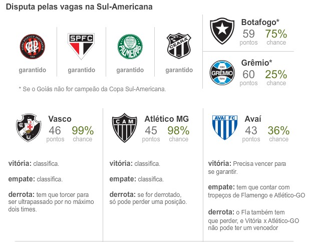 O título do Goiás deixaria tanto Grêmio quanto Botafogo classificados para a Sul-Americana e isso também influencia na turma de baixo. Ou seja, o último a ter vaga para a competição do ano que vem seria o 13º e não mais o 14º. Assim sendo, Vasco, Atlético-MG, Avaí, Flamengo, Atlético-GO e Vitória só disputariam duas vagas. Se o Alviverde goiano for vice, seriam três.
