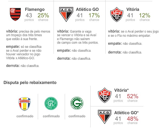 Outro ponto que pode gerar dúvida é como o Vitória pode ter mais chance de ser rebaixado do que o Atlético-GO e ao mesmo ter possibilidade maior de se classificar para a Copa Sul-Americana.