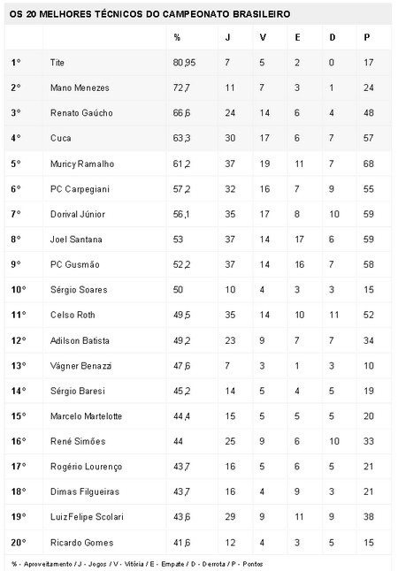 Responsável pela arrancada do Grêmio no torneio, Renato Gaúcho aparece em terceiro, com 66,6%. Logo atrás está o técnico Cuca, que ainda sonha com o título do Cruzeiro, e que tem um aproveitamento de 63,33%. Somente na quinta colocação aparece Muricy Ramalho, que conquistou 61% dos pontos que disputou no Brasileiro.