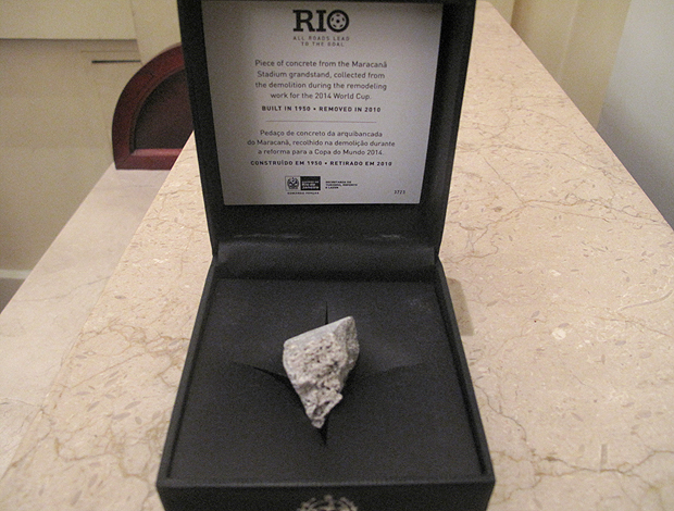 Mensagem na caixa com a pedra diz: pedaço de concreto do Maracanã recolhido na demolição durante a reforma para a Copa do Mundo de 2014