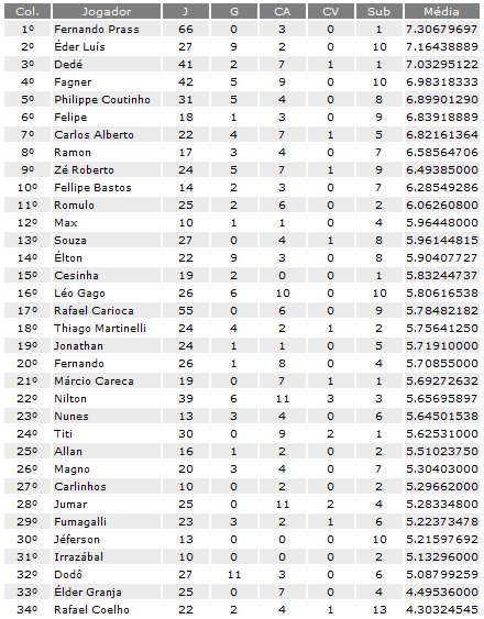 O segundo colocado foi o atacante Éder Luís, que obteve média 7,16 em 27 partidas disputadas, travando um duelo com Fernando Prass durante boa parte do Campeonato Brasileiro, quando chegaram a trocar de posição algumas vezes. A terceira posição ficou com o zagueiro Dedé, que, em 41 jogos, conseguiu média 7,03. O lateral-direito Fagner e o meia Phillipe Coutinho, completam a relação dos cinco primeiros colocados.