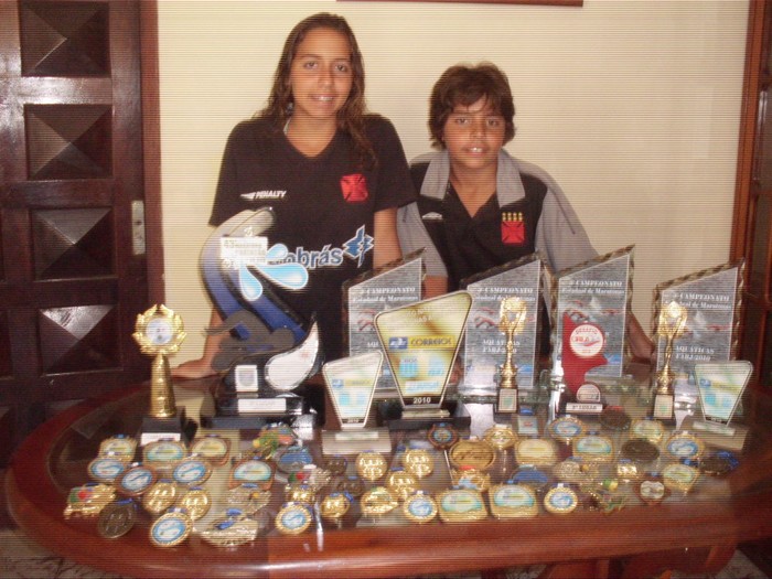 Os nadadores vascaínos Mariana Mello e Pedro Mello exibem as medalhas e troféus conquistados em 2010, em provas de natação e maratonas aquáticas:
