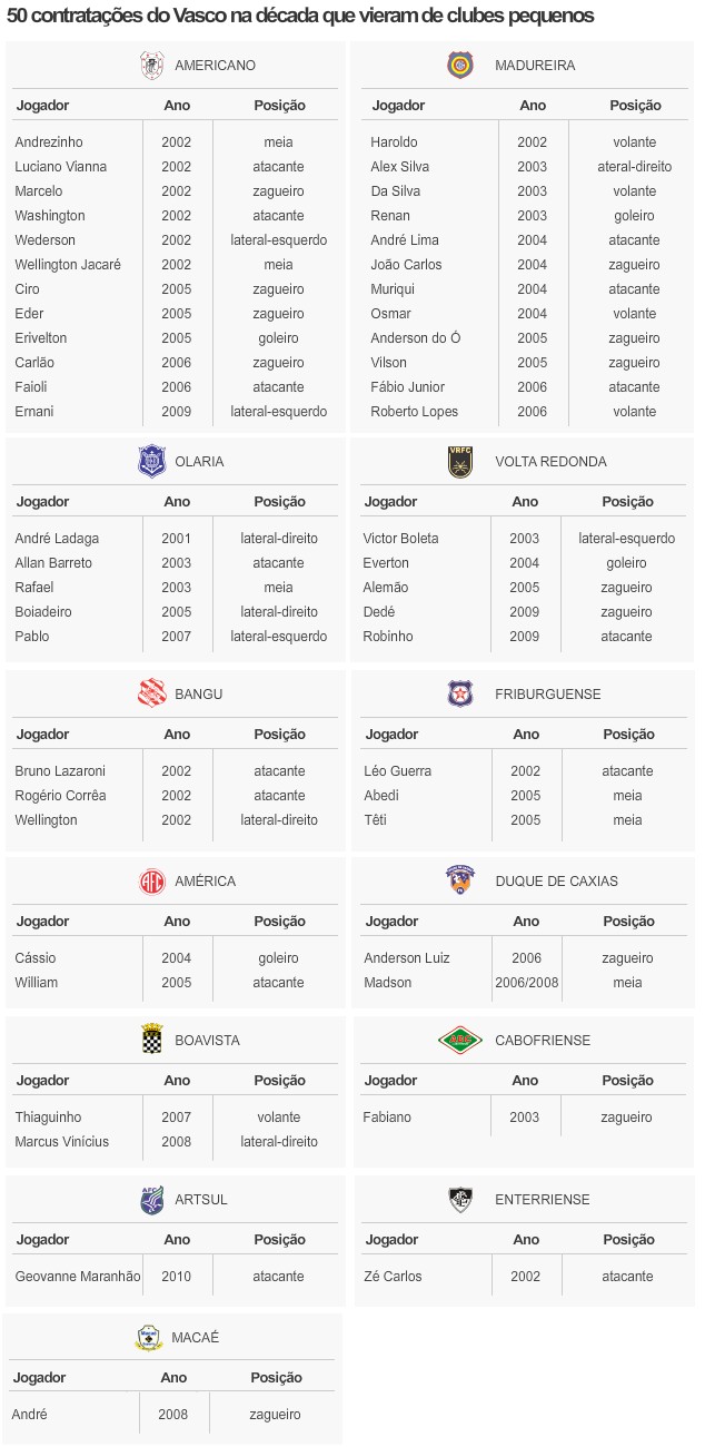 Durante a década, Vasco apostou constantemente em reforços vindos de clubes pequenos do Rio, como Anderson do Ó, Roberto Lopes, Victor Boleta, Erivelton, Alemão e Ciro