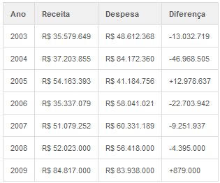 Independentemente da maneira de fazer as contas, o fato é que quase todos os balanços publicados a partir de 2003 (ano em que a divulgação passou a ser obrigatória) mostram que as despesas anuais foram maiores do que as receitas. As exceções ficam pelos anos de 2005 e 2009 (veja no quadro abaixo).