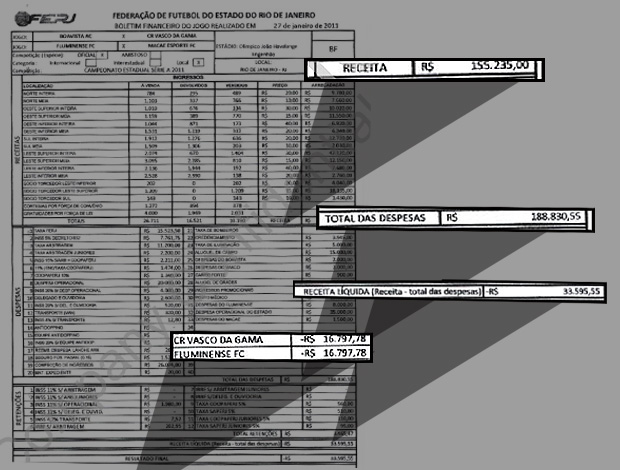 A Federação de Futebol do Estado do Rio de Janeiro (Ferj) divulgou nesta sexta-feira o borderô referente à rodada dupla desta quinta-feira, no Engenhão. No fim das contas, Vasco e Fluminense ainda ficaram devendo, cada um, R$ 16.797,78.