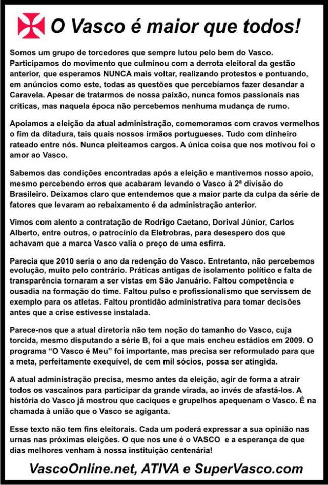 Torcedores publicam anúncio em jornal em protesto pela má fase do Vasco