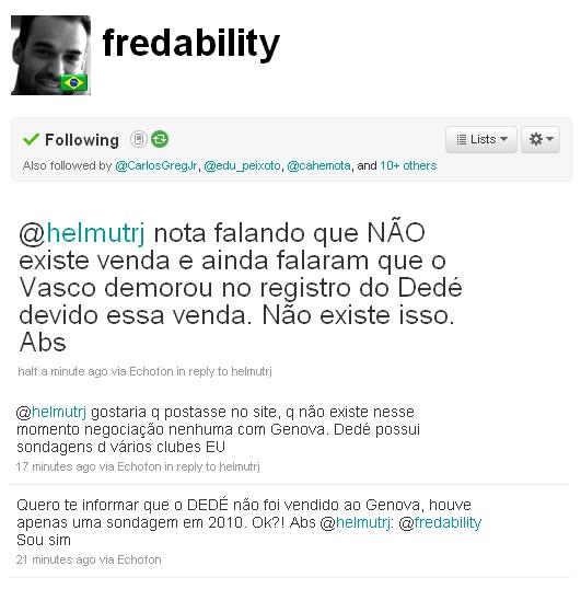 O empresário Fred Souza, da Ability Sports, informou em seu twitter na tarde desta terça-feira (08/02) que o zagueiro Dedé não foi negociado com o Genoa, da Itália. O empresário observou que houve apenas uma sondagem do clube italiano pelo zagueiro cruzmaltino. Confira abaixo: