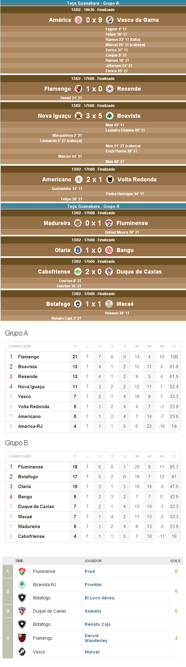 Terminada a 7ª e última rodada da 1ª fase da Taça Guanabara, que corresponde ao 1º turno do Campeonato Estadual, o Vasco, que goleou o América por 9 a 0, subiu mais uma posição e terminou na 5ª colocação do Grupo A. Na classificação geral, o Gigante da Colina subiu do 13º para o 9º lugar, que é a sua colocação final na Taça GB.