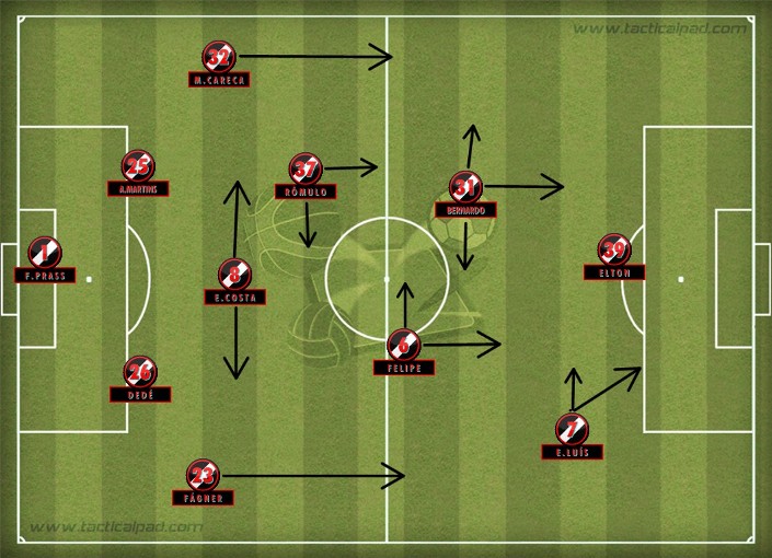 A começar pelo posicionamento dos laterais Fágner e Ramon, que avançam simultaneamente, tanto no apoio quanto na caça aos adversários e deixam verdadeiras crateras às suas costas que Dedé e Anderson Martins precisam cobrir e, muito abertos, escancaram o meio da área obrigando os volantes, já sacrificados pela falta de combatividade dos meias no 4-2-2-2 cruzmaltino, a recuar demais e, com isso, deixar generosos espaços na intermediária. Um verdadeiro “efeito dominó”.