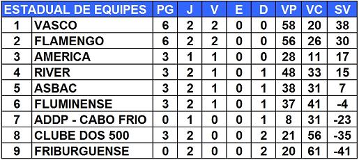 Tivemos no último domingo a 2ª rodada do Campeonato Estadual de Equipes - Modalidade Dadinho. O Vasco da Gama segue em primeiro lugar na tabela, tendo o Flamengo com a vice-liderança.
