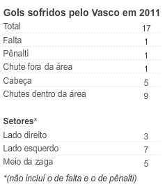 As opções no setor ofensivo do Vasco são tantas que o técnico Ricardo Gomes tem tido uma constante dor de cabeça para arrumá-las da melhor maneira possível. A defesa também tem dado trabalho, mas pelo motivo inverso. Os gols sofridos são motivo de incômodo. Foram 17 em onze jogos disputados na temporada (confira todos os gols no vídeo ao lado). O fato já chamou a atenção do treinador, que fez testes em quase todas as posições buscando corrigir os erros. Este é o pior início de temporada da defesa vascaína desde 1967, quando o clube sofreu 20 tentos com o mesmo número de partidas iniciais.