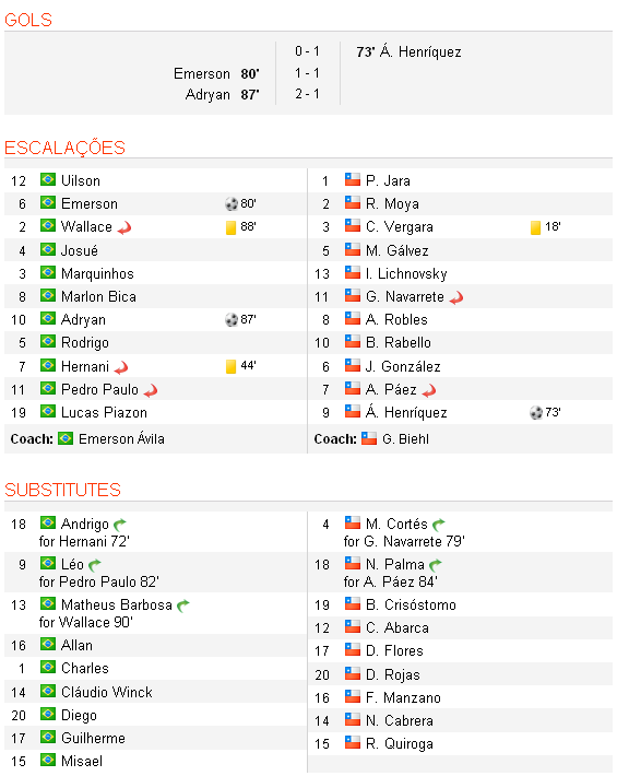 O gol parecia questão de tempo. No entanto, a defesa brasileira voltou a falhar. Aos 28min, após outro erro de posicionamento da defesa brasileira, Henríquez marcou de cabeça. A resposta foi rápida. Apenas seis minutos mais tarde, Emerson aproveitou rebote e deixou tudo igual. Aos 42min, Adryan cobrou falta com perfeição e selou a segunda virada seguida do Brasil.