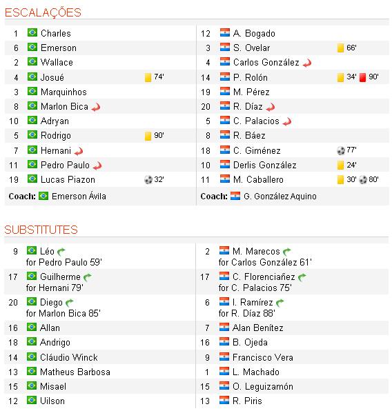 A virada saiu quatro minutos depois. Após cobrança de escanteio, a defesa do Brasil não subiu, Caballero subiu bem e marcou de cabeça, garantindo a vitória de 2 a 1 dos paraguaios, que haviam perdido na estreia por 3 a 1 para a Colômbia (o Paraguai só tem dois jogos no torneio até agora).