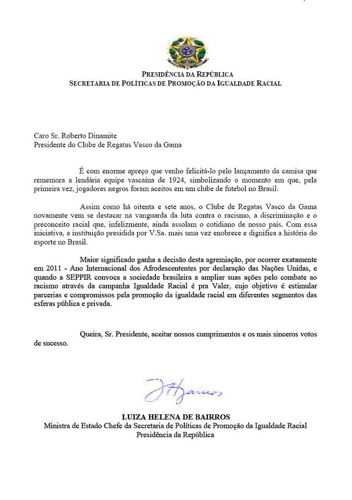 Ministra da Igualdade Racial parabeniza o Vasco por lançamento de camisa