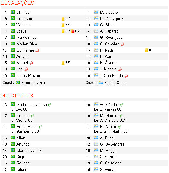 Charles, Wallace, Josué, Marquinhos(C) e Emerson; Misael(Pedro Paulo) e Marlon Bica; Lucas Piazon, Guilherme(Hernani) e Adryan; Leo(Matheus).
