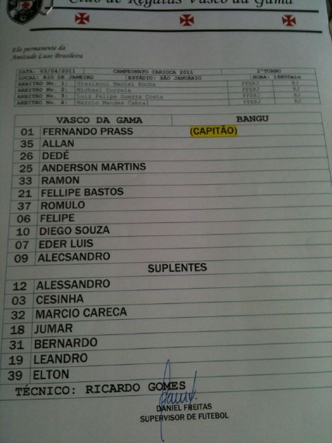 Confira escalação oficial do Vasco para o jogo contra o Bangu