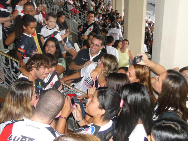 Mau Mau assistiu à vitória vascaína na tribuna de honra do clube. No intervalo, o assédio dos torcedores, principalmente das mulheres, foi impressionante. Mas Maurício mostrou muita paciência e atendeu a todos os pedidos de fotos e até mesmo de beijos - na bochecha, é claro. Feliz, o cantor agradeceu aos vascaínos pela recepção.
