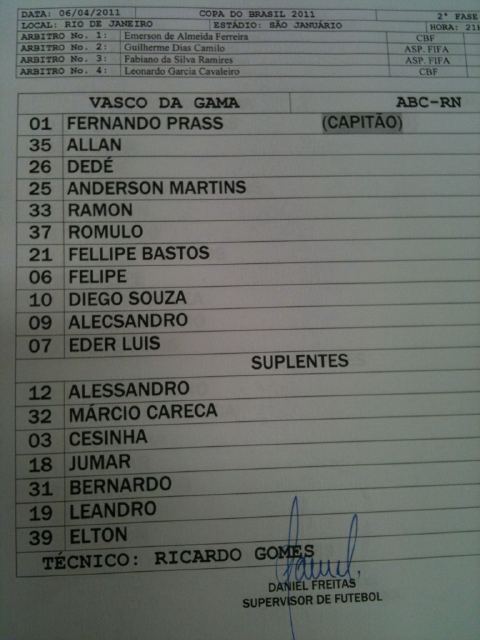 Confira escalação oficial do Vasco para o jogo contra o ABC