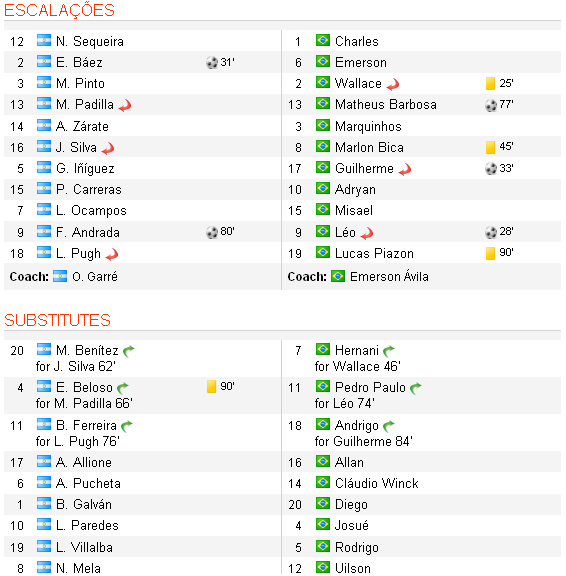 O técnico Emerson Ávila levou a campo a seguinte escalação neste sábado: Charles (Cruzeiro), Wallace (Fluminense), Matheus (Grêmio), Marquinhos (Corinthians) e Emerson (Santos); Marlon Bica (Inter-RS), Misael (Grêmio), Guilherme (Vasco), Adryan (Flamengo) e Lucas Piazon (São Paulo / Chelsea); Léo (Cruzeiro).