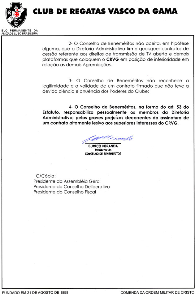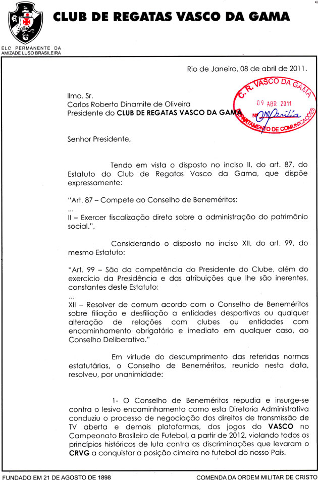 Conselho de Beneméritos enviou carta à diretoria sobre contrato de TV