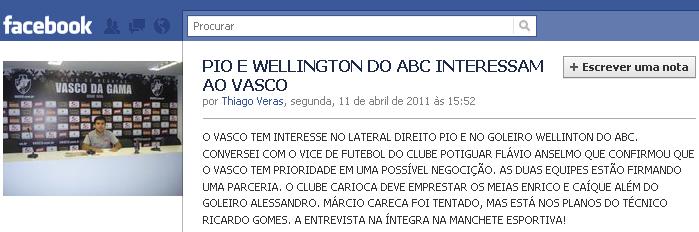 Além do goleiro Wellington, Vasco estaria interessado no lateral Pio, do ABC