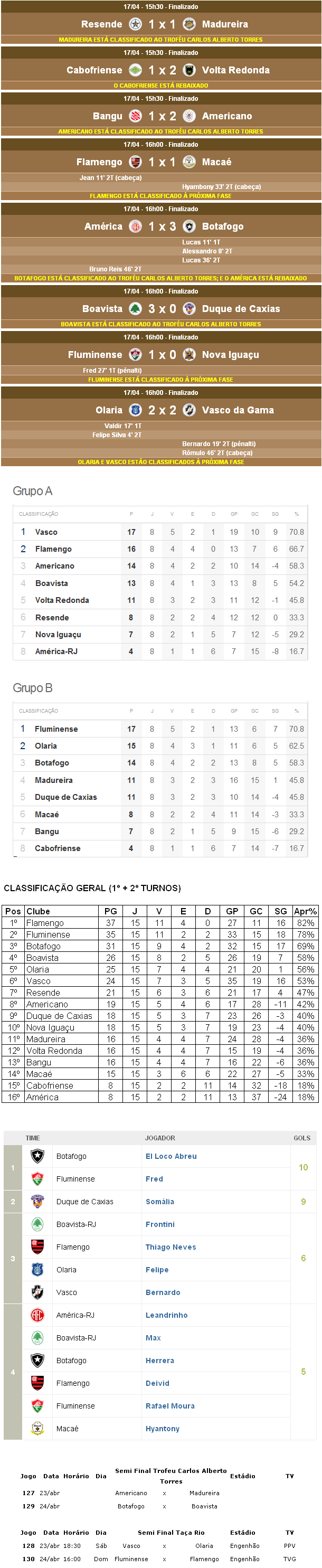 Terminada a 8ª e última rodada da 1ª fase da Taça Rio (que corresponde ao 2º turno do Campeonato Estadual), o Vasco, que empatou com o Olaria por 2 a 2, garantiu a 1ª colocação do Grupo A de forma isolada, 1 ponto à frente do vice-líder Flamengo. O Gigante da Colina tem a melhor campanha da Taça Rio. As semifinais serão as seguintes: Vasco (1º de A) x Olaria (2º de B); Fluminense (1º de B) x Flamengo (2º de A).
