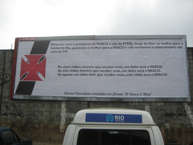 No ultimo dia 29 de março, sócios do clube reunidos no forum “VASCO É MEU”, insatisfeitos com a forma como foi conduzido a renovação do contrato da TV pela diretoria do Vasco, colocou um outdoor na frente do clube com dizeres pacificos porém contrários ao atual mandatário Roberto Dinamite. Antes da partida entre Vasco e ABC, pela Copa do Brasil, o outdoor foi tapada para que a torcida Vascaína não pudesse ver o outdoor.