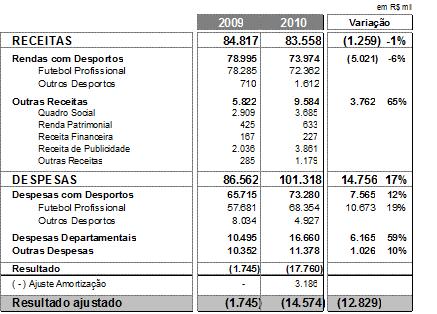 A análise dos resultados obtidos no exercício de 2010 confirma a expectativa de que o orçamento elaborado pelo clube estaria distante de qualquer correspondência com a realização econômico-financeira no período.