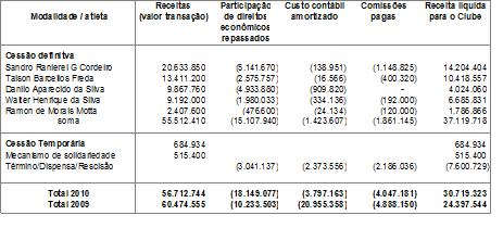 As aquisições ocorridas, durante o exercício findo em 31 de dezembro de 2010, incluem, principalmente, os valores relacionados a percentuais de direitos econômicos para aquisição ou manutenção (termo de renovação de contrato) dos direitos federativos dos atletas: Wilson Tiago Matias, Dalton Moreira Neto, Elton Divino Celio, Ronaldo Conceição Silveira, Talles Henrique da Cunha, Frederico Rodrigues de Paula Santos, Paulo Cesar Fonseca do Nascimento, Eduardo Concenti Antunes, Ronaldo Luiz Alves, Kaoe Folles Ferreira da Silva, César Augusto Gomes Nascimento, Elton Junior Melo Ataide e Marcos Vinicius Rocha Vilela.