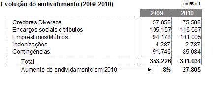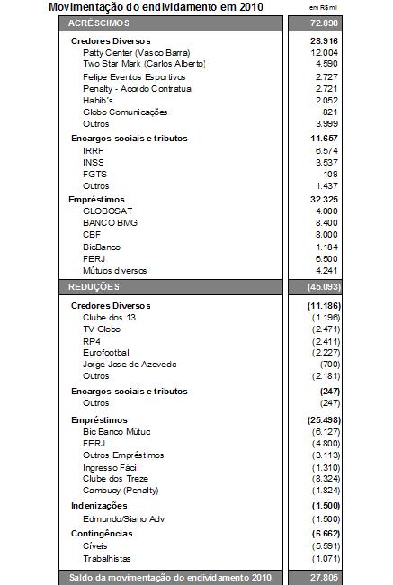 O expressivo prejuízo apresentado, o conhecido problema de liberação dos recursos financeiros das verbas de patrocínio e os lançamentos referentes a exercícios anteriores contribuíram para o aumento do endividamento do clube em R$ 27,8 milhões, o que corresponde a um crescimento de 8%, e ao saldo total de R$ 381 milhões em 31 de dezembro de 2010, conforme discriminado no quadro a seguir.