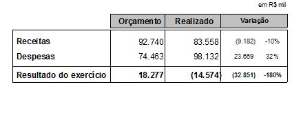 As receitas inferiores às projetadas, combinadas com o acréscimo de um terço das despesas, resultaram em prejuízo de R$ 14,6 milhões, bem distante do lucro orçado de R$ 18,3 milhões (-180%).