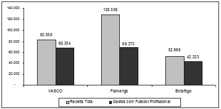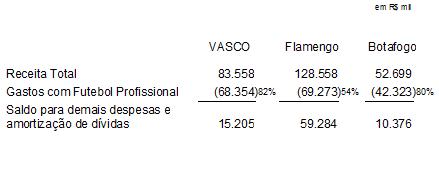 Aqui, foram levantadas as informações constantes dos balanços de alguns clubes brasileiros, para efeito de comparação com os resultados obtidos pelo Vasco. No quadro a seguir, os valores de receitas totais e os gastos com futebol profissional de três grandes clubes do Rio de Janeiro são confrontados. Por apresentarem distorções nas classificações, os números do Fluminense não foram considerados.