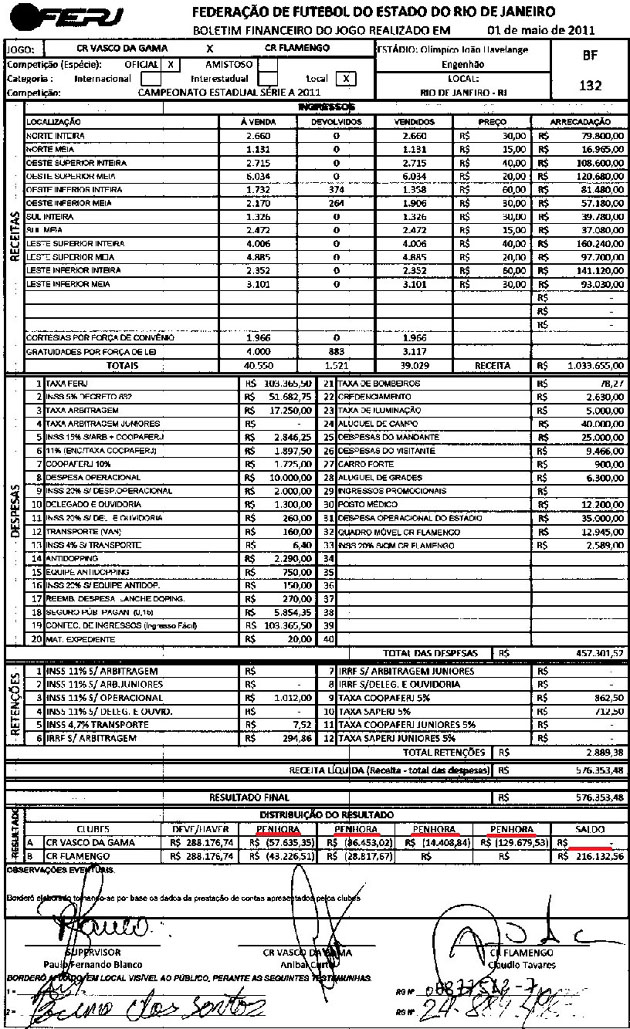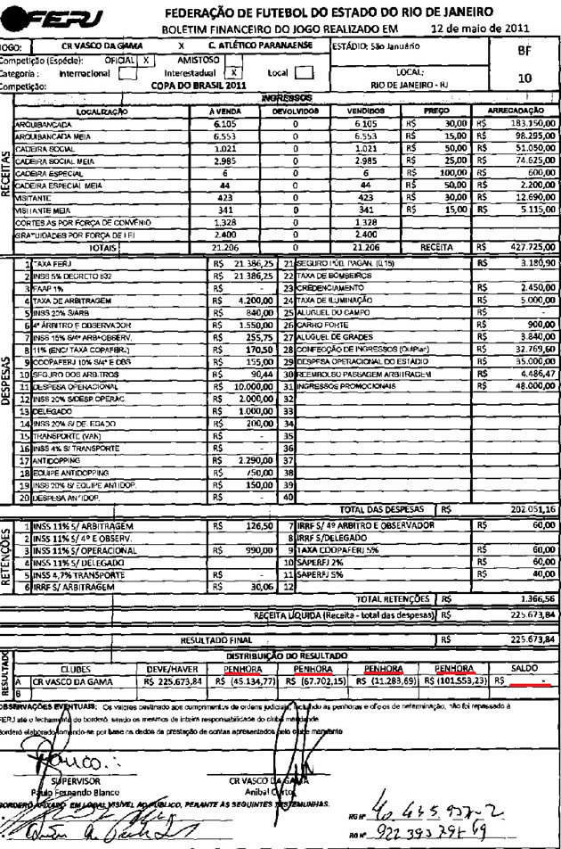 Cota do Vasco na renda de seus 2 últimos jogos foi toda penhorada