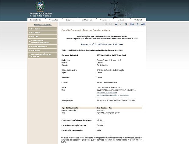 Desde a última quinta-feira, o processo está com a juíza Fernanda Xavier de Brito, que vai decidir se acata a liminar de Denis Antônio Carrega Dias, benemérito do Vasco e membro do grupo político de Eurico. O processo ainda está em primeira instância na 37ª Vara Cível. Além do Vasco, o presidente da Assembléia do clube, Olavo Monteiro de Carvalho, também é réu no processo.