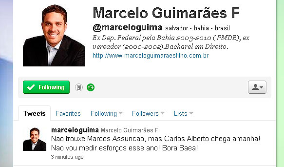 - Não trouxe Marcos Assunção, mas Carlos Alberto chega amanhã! Não vou medir esforços esse ano! Bora Baea! – escreveu Marcelinho.