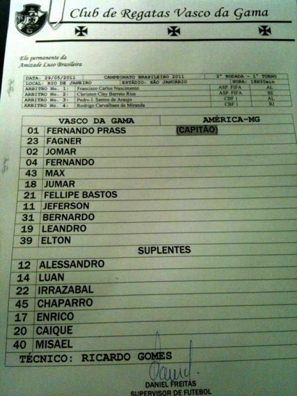 Confira a escalação oficial do Vasco para o jogo contra o América-MG