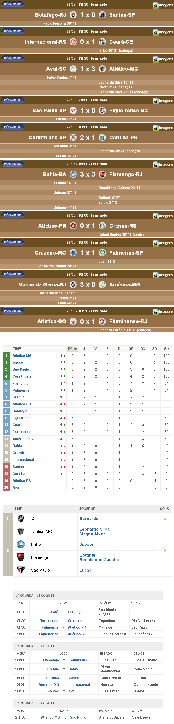 Terminada a 2ª rodada do Campeonato Brasileiro 2011, o Vasco, que derrotou o América-MG por 3 a 0, subiu da 3ª para a 1ª colocação na tabela. O Gigante da Colina só atuou até agora na competição com o Expressinho (seu time reserva).
