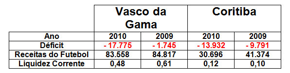 Em 2010 para cada real de dívida o Vasco possui R$0,48 centavos para paga-lo, já o Coxa, para cada 1 Real de dívida no curto prazo possui R$ 0,12 centavos, ou seja, se ambos os clubes fechassem as portas em 31 de dezembro com base nos balanços não teriam como pagar os credores.