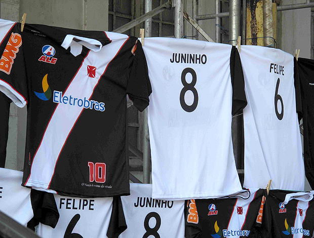 Juninho Pernambucano só vai se apresentar de maneira oficial ao Vasco no próximo sábado, dia 11, antes do jogo contra o Figueirense, em São Januário. Mas a chegada do ídolo já mexe com a torcida e com os ambulantes. De plantão na portaria social da sede do clube, inúmeros vendedores já penduraram em seus varais camisas com o nome do craque e o número 8 que o consagrou. As vendas estão sendo boas até o momento. Cada camisa sai por R$ 35. O outro modelo é com o nome de Felipe.