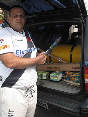 Entre cantos, batucadas e bandeiras, algumas explosões levantavam ainda mais o astral dos milhares de vascaínos que foram recepcionar o time campeão da Copa do Brasil no início da tarde desta segunda-feira, no Aeroporto Santos Dummont, no Rio de Janeiro. O principal responsável por elas era Luiz Felipe Nazaré. O torcedor de 44 anos gastou mais de R$ 300 em morteiros e foguetes para homenagear os responsáveis pelo fim do jejum de oito anos sem títulos de Primeira Divisão.