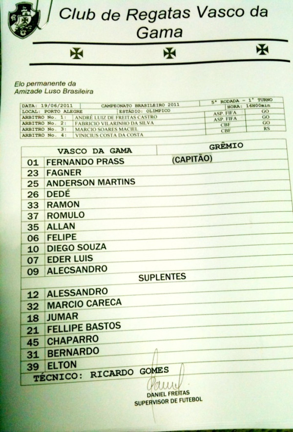 Confira a escalação oficial do Vasco para o jogo contra o Grêmio