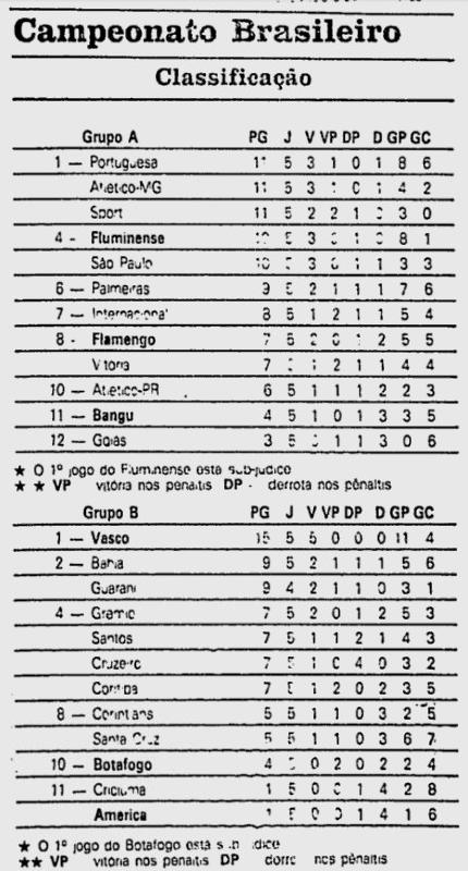 Classificação do Brasileirão de 1988 publicada pelo Jornal do Brasil, com o Vasco líder absoluto com 5 vitórias em 5 jogos. Naquele ano, os jogos que terminavam empatados eram decididos nos pênaltis.