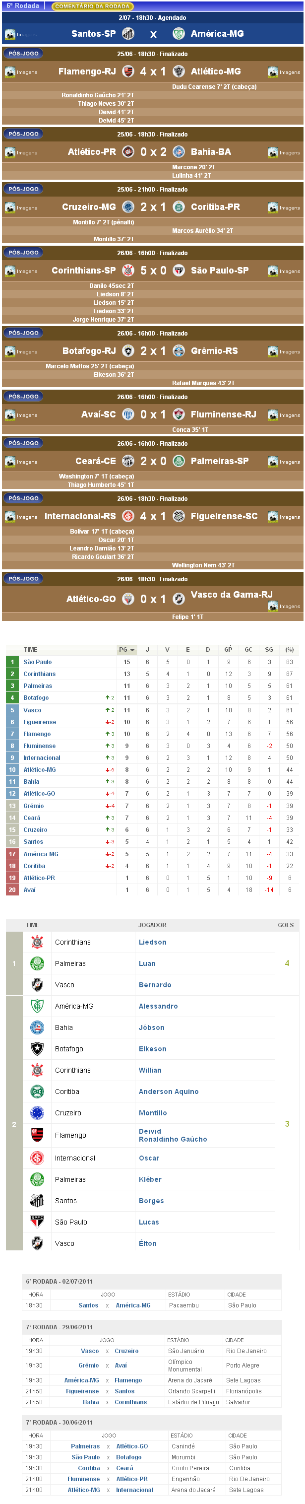 Faltando um jogo para o fim da 6ª rodada do Campeonato Brasileiro 2011 (Santos x América-MG, remarcado para 02/07), o Vasco, que venceu com o Atlético-GO por 1 a 0, subiu da 7ª para a 5ª colocação na tabela.