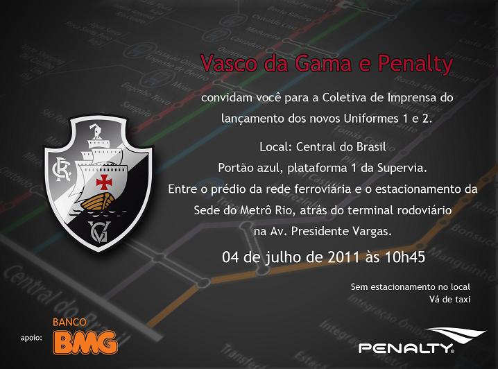 O Club de Regatas Vasco da Gama e a Penalty convidam para o lançamento do novo uniforme do Gigante da Colina, na próxima segunda-feira, dia 4 de julho, a partir das 10h45, na Central do Brasil. Para otimizar o trabalho, a entrada dos profissionais de imprensa se dará pela entrada lateral da gare, próxima à Avenida Prestes Maia, portão azul, plataforma 1 da Supervia.