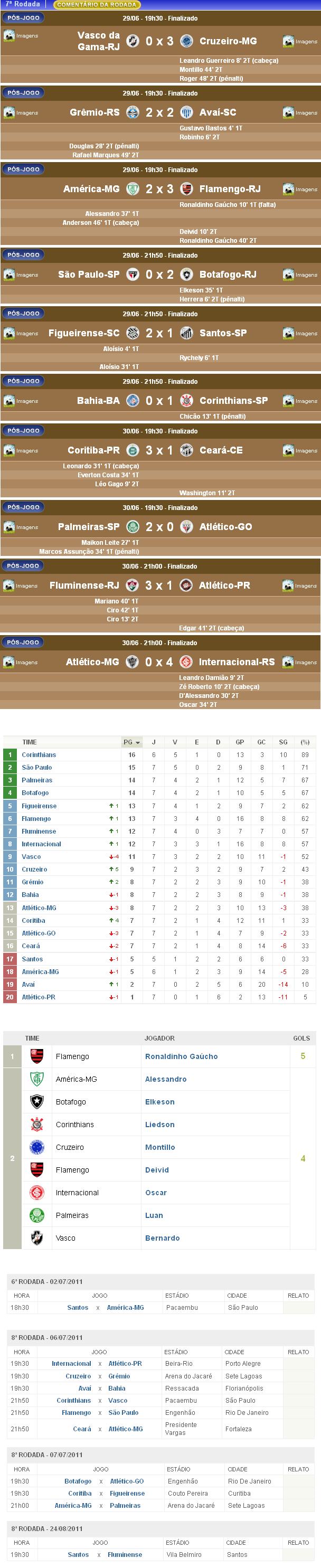 Terminada a 7ª rodada do Campeonato Brasileiro 2011, o Vasco, que perdeu para o Cruzeiro por 3 a 0, caiu da 5ª para a 9ª colocação na tabela.