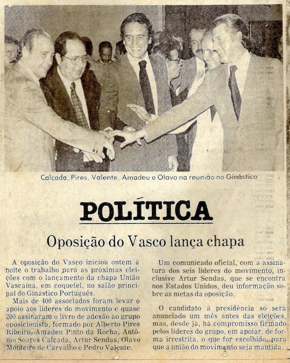 Em 1979, Pedro Valente participou ativamente da chapa "União Vascaína". Ao lado de outros cinco grandes vascaínos (Alberto Pires Ribeiro, Amadeu Pinto da Rocha, António Soares Calçada, Artur Sendas e Olavo Monteiro de Carvalho), estava formado à época o grupo batizado de "Os Seis Homens de Ouro". No ano seguinte, Alberto Pires Ribeiro foi eleito presidente do Vasco.